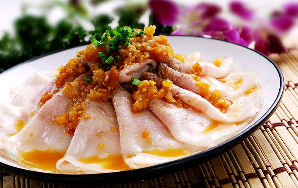 蒜泥白肉为传统渝菜,选料精,火候适宜,刀工好,佐料香。食时用筷拌着吃,有一股酱油、芝麻油、辣椒油和大蒜组合的浓郁香味。